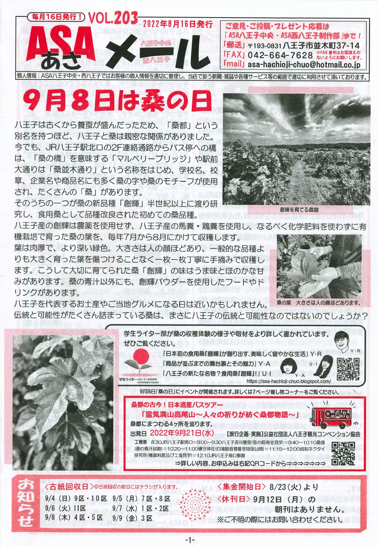2022年8月16日号のASAメール(vol.203)1面にて桑「創輝」をご紹介いただきました!